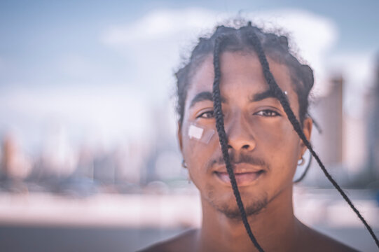 17 year old afro descendant teenager with braids in hair and no shirt, various facial expressions, lifestyle concept, coppy space