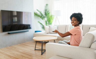 Cheerful cute woman sitting on sofa in bright living room changing tv channel
