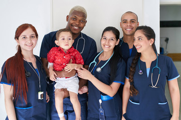 Team of young friendly doctors holding a baby patient