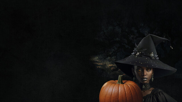 An afroamerican halloween witch with a pumpkin