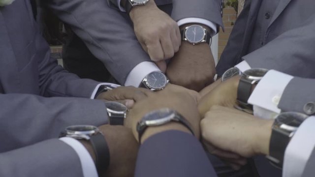 Fists of afroamerican men dressed in suits and elegant watches on the wedding day, concept of the friendship, front view