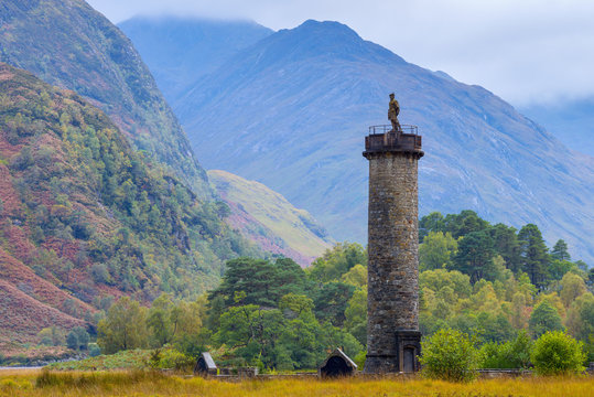 Monument to 1745 landing of Bonnie Prince Charlie at start of Jacobite Uprising, Glenfinnan, Loch Shiel, Highlands, Scotland