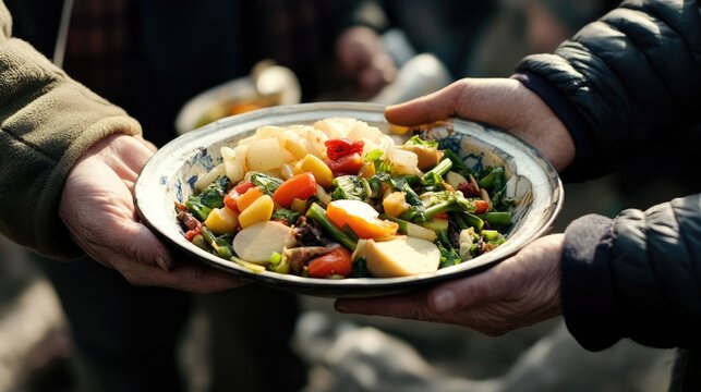 Close up of volunteer giving free hot meals to refugees at soup kitchen, focus on hands holding plate