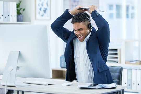 Stress, angry or shouting call center businessman breaking computer keyboard in crm consulting fail, sales deal risk or 404 glitch. Mad, screaming or crazy customer support agent in technology smash