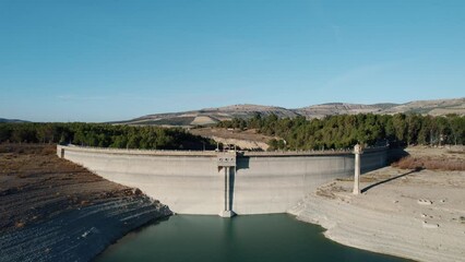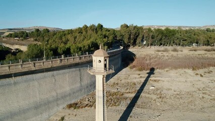 Flying over the manmade dam wall structure of the famous Los Bermejales a reservoir in Arenas del Rey, province of Granada, Andalusia, Spain. With low water levels and revealing the afterbay.
