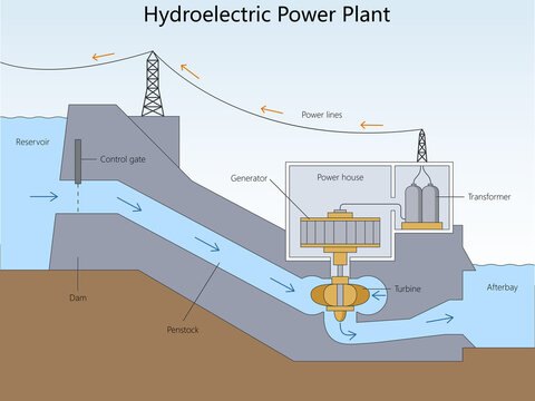 hydroelectric power plant showing reservoir, dam, penstock, turbine, generator, transformer, power lines, and electricity flow diagram hand drawn schematic vector. Science educational illustration