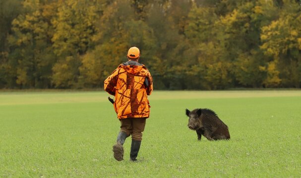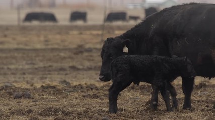 close up of a piglet delivery head first and woman cleaning afterbirth off his face with a towel; piglets suckling on the sow's teats for milk in the background