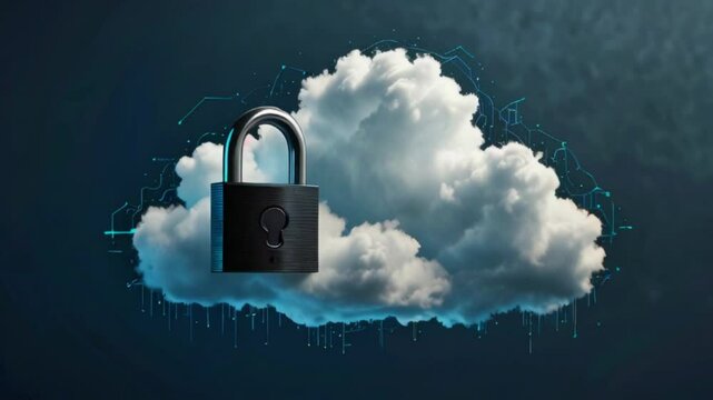 A dark blue background with a white cloud in the center. There is a black lock on the cloud.
