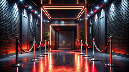 Glowing neon lights illuminate a trendy nightclub's entrance, where a sleek black flyer with silver font lies on a velvet rope, surrounded by darkness.