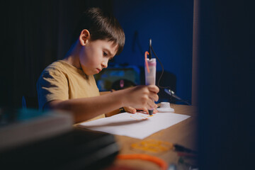 Caucasian youth deeply focused on his homework with warm desk illumination