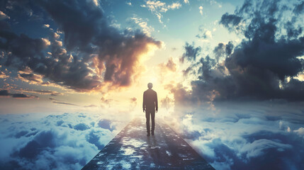 Man walking on road above clouds towards light. Rear view of man on road above the clouds walking toward bright light, concept for success, future, afterlife
