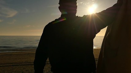 man opening a curtain with seascape and sunrise view silhouette approaching camera