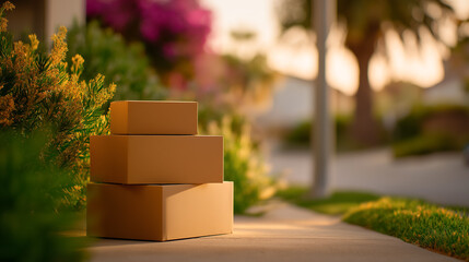 Stack of cardboard boxes waiting for pick up in warm light along peaceful residential street. Concept of eco-friendly actions, sustainability, delivery services