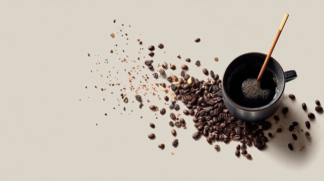 Start your day right with a vibrant cup of dark roast coffee and scattered beans, perfect for morning routines or a mid afternoon pick me up