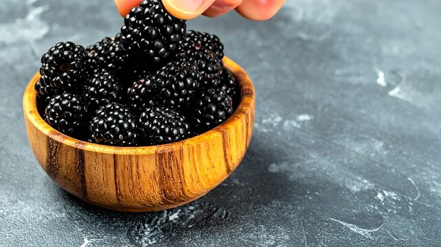 A wooden bowl filled with plump, dark berries. A finger is reaching for one to pick up