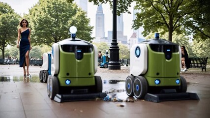 Two cleaning robots work to pick up trash in a city park. A woman walks past them in a dress. The scene takes place on a sunny day with trees and buildings in the background