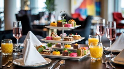 A stylish table set for afternoon tea features a tiered tray of assorted pastries, macarons, and tarts, with glasses of juice and sparkling wine.