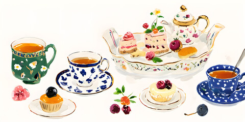 Watercolor illustration of British afternoon tea,tea break in the English style,tea set with Afternoon tea stand with macaroons and scone,cake,cup of tea,Tea time dessert table,vintage style.