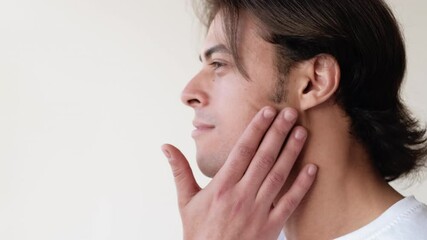 Young man having a shaving daily beard grooming routine,applying aftershave lotion.Allergic itchy rash burn reaction to hygiene skin care product.Facial hair removal.Shaving for work.Beard trim shave