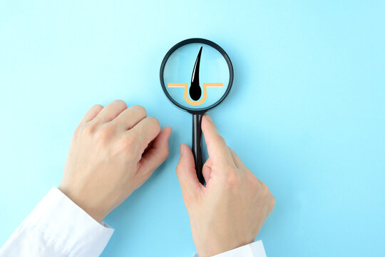 Magnifying glass on researcher hand with hair pores background. Medical lifestyle and healthcare concept. Dermatologist and doctor theme.