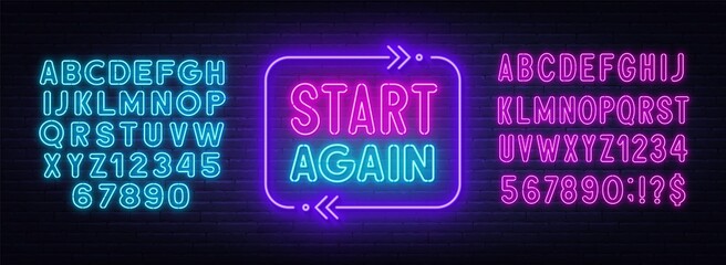Start again neon sign on a brick background.