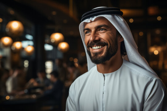 Arabic man indoor smiling while wearing traditional white Shemagh gown with black agal