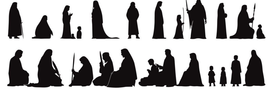 Silhouette set of Arabic Muslim family men women children in traditional thobe kandura ghutra agal clothing holding swords sceptre sitting and standing in flat minimalist style vector