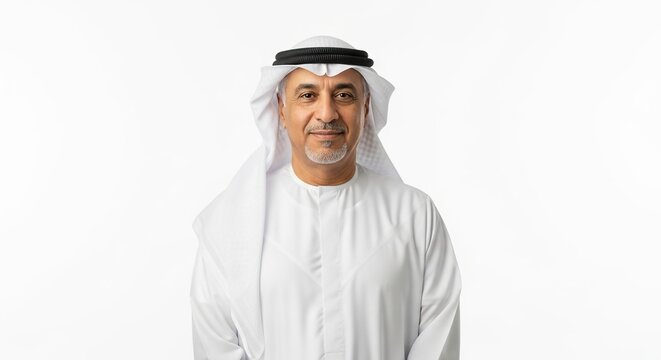 Confident Middle Eastern businessman in traditional attire portrait looking at camera isolated on white background