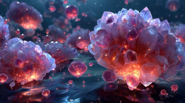 Stunning Underwater Crystal Landscape: Vibrant Crystalline Structures with Radiant Highlights in a Mysterious Ethereal Depth, Enhanced by Intricate Textures and Iridescent Bubbles