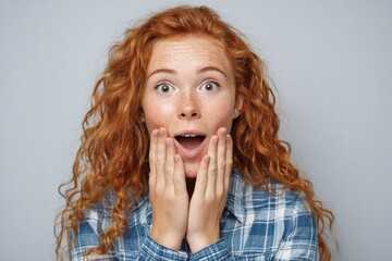 A young woman with vibrant red curly hair expresses astonishment, her mouth agape in a portrait shot against a neutral backdrop.