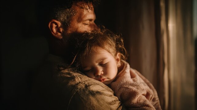 Father holds his sleeping daughter near window with natural warm light. This tender image captures family bonding moments and parental love.
