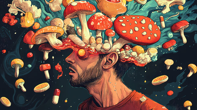 Drug addiction. addict. a man with fly agarics on his head, hallucinating while taking drugs. hallucinogens. the problem of drug addiction in society. Crystalpath. Illustration