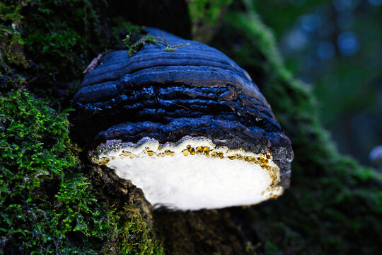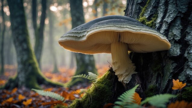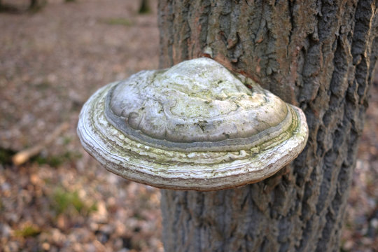 White tree conk mushroom growing on tree bark in the forest