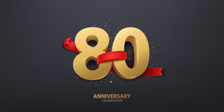 80th Year anniversary celebration background. 3D Golden number wrapped with red ribbon and confetti, isolated on dark background.