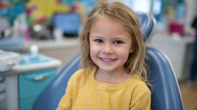 Smiling little girl sitting in a colorful pediatric dental chair, bright healthy teeth shining, playful wall decorations in the background, dental tools softly blurred, cheerful at