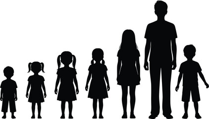 Children growth stages silhouette lineup, different ages height comparison development childhood progression family generation concept illustration - flat vector illustration