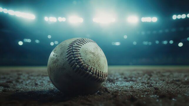 close-up of an aged baseball resting on a field, illuminated by bright stadium lights, conjuring a sense of nostalgia and excitement for the game