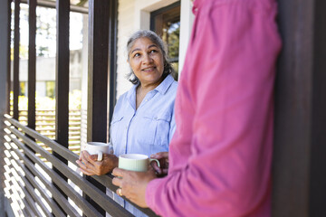 Senior biracial woman with grey hair holds a coffee cup, smiling warmly