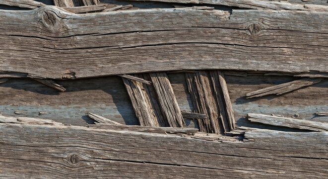 Weathered wooden planks reveal a hole with splintered wood displaying age and decay