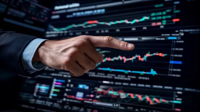 A close up of a businessmans hand pointing to a specific point on a forex trading graph displayed on a computer screen, highlighting a crucial moment in stock market investments