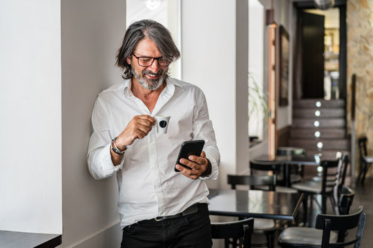 Positive ethnic aged bearded gray haired man browsing smartphone and having coffee while leaning on wall in empty cafe at daytime