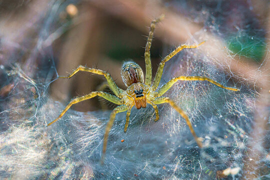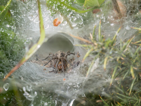 Labyrinth or Funnel-web Spider (Agelena labyrinthica) lurking in its web or retreat