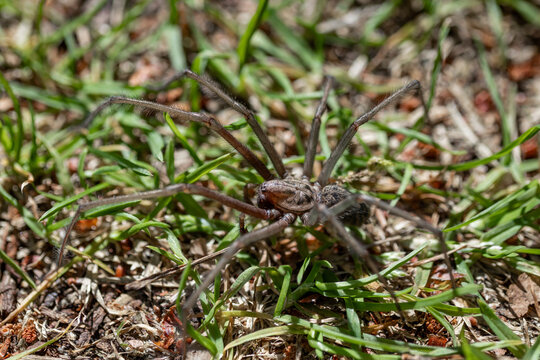 giant house spider (Eratigena atrica), family Agelenidae on a rough concrete surface. Summer, July, Netherlands.