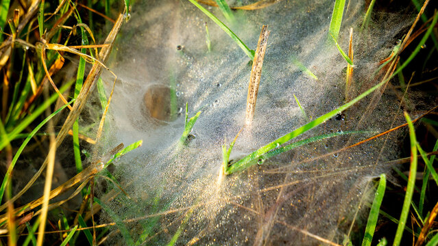 Ground spider webs. It is often funnel-shaped webs built by grass spiders and other members of the Agelenidae family.