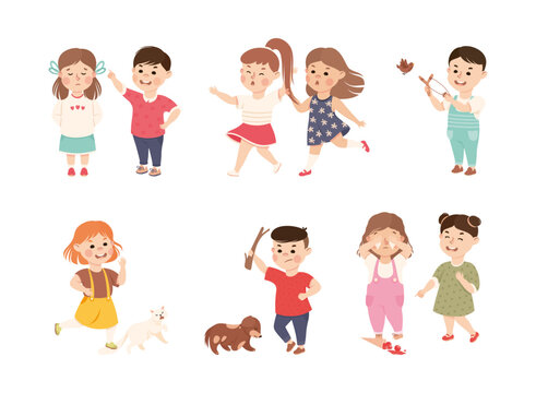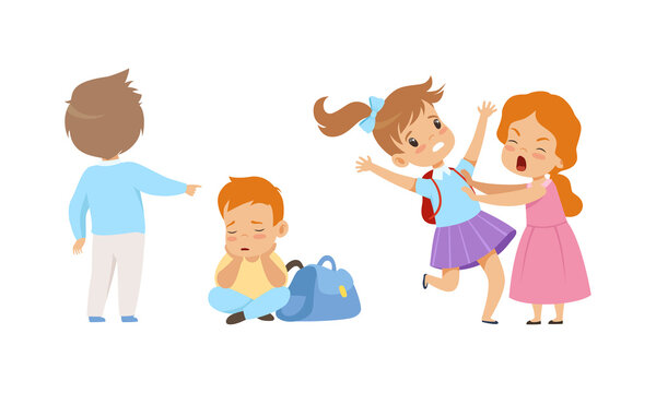 Angry Kids Bullying and Abusing the Weak Agemate Teasing and Laughing at Them Vector Set