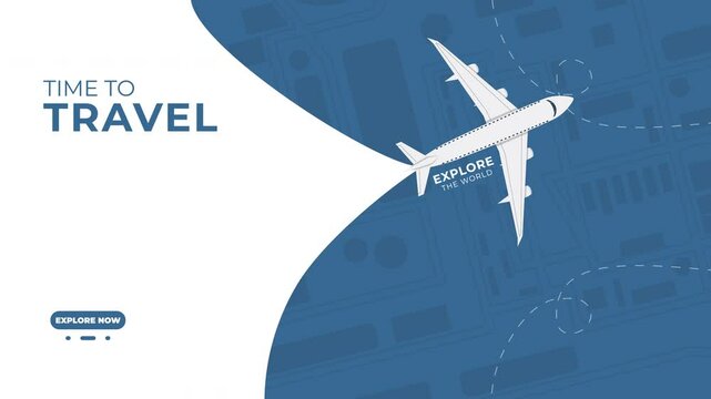 Landing page or web travel flat design template animation with dynamic airplane motion. Clean, minimalist, smooth, perfect for airlines, travel agencies, presentations, or booking platforms.