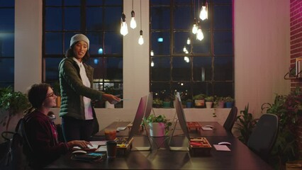 Night business women, creative agency and computer planning for ideas, collaboration and online web design in dark office. Marketing team employees working desktop pc for internet graphics together