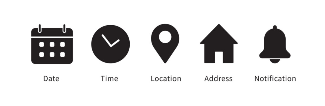 Date, Time, Address icon set. Event icons vector. Location, Calendar & clock icon transparent png