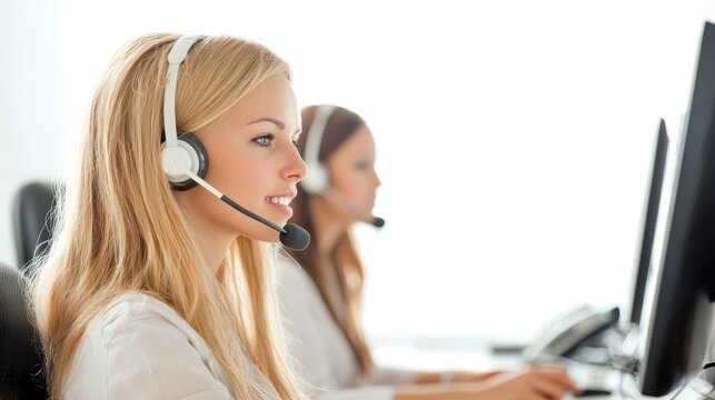 Call center agent wearing a headset while assisting a customer. Featuring professionalism and customer service