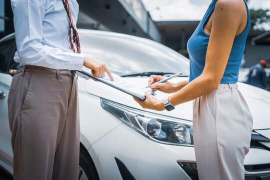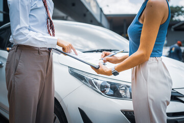 A young Caucasian man and an Asian woman inspect a damaged car after an auto accident. The insurance agent examines the vehicle, writing a report while gathering evidence for the claim investigation a